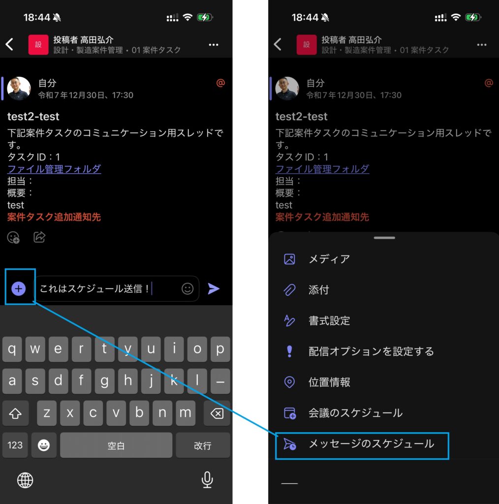 Teamsのスケジュール送信は投稿の「+」ボタンより選択可能です。返信時は送信ボタン長押しでも可能ですが、この操作だと間違って即送信してしまいがちなのでご注意ください。