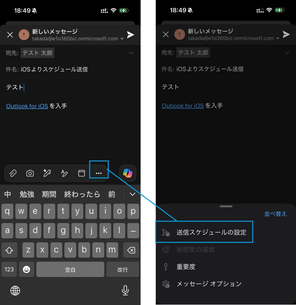 Outlookのスケジュール送信は「…」メニューより選択可能です。スマートフォンからも下書きフォルダで予約状況が確認・管理可能です。