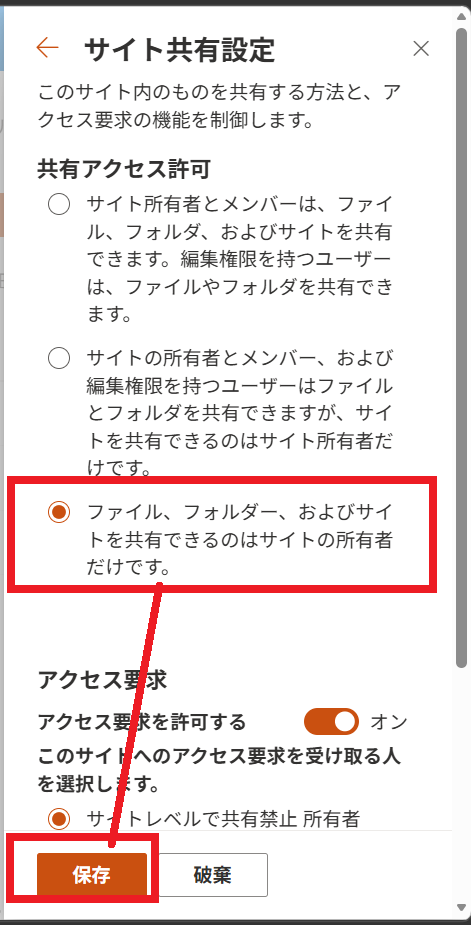 [ファイル、フォルダー、およびサイトを共有できるのは所有者だけです。]に変更して[保存]をクリックします。